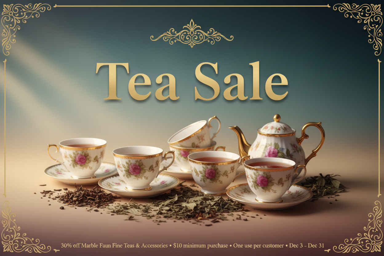 Use Code TEA30 for 30% off Marble Faun Fine Teas & Accessories. $10.00 minimum purchase. December 3 - December 31, 2025.