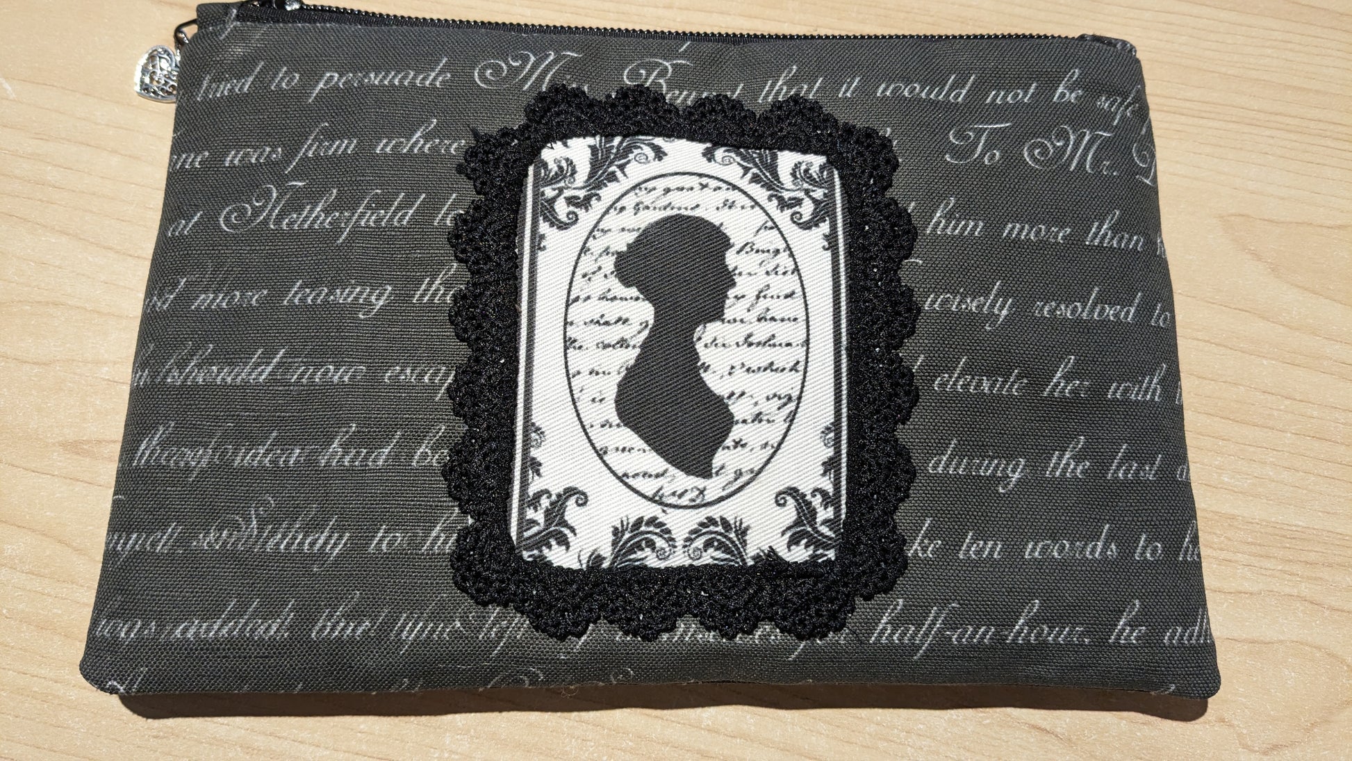 Inspired by Jane Austen with her famous silhouette with lace on chalkboard script fabric from Pride and Prejudice. This pencil case/makeup bag measures 8.5 x 5.5". Made by The Marble Faun.