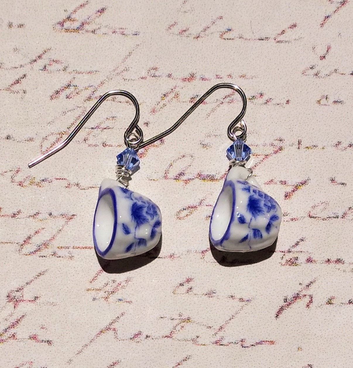 Lovely blue and white porcelain miniature tea cups wire-wrapped with light sapphire crystals. Wires are hypoallergenic. Made exclusively by The Marble Faun.