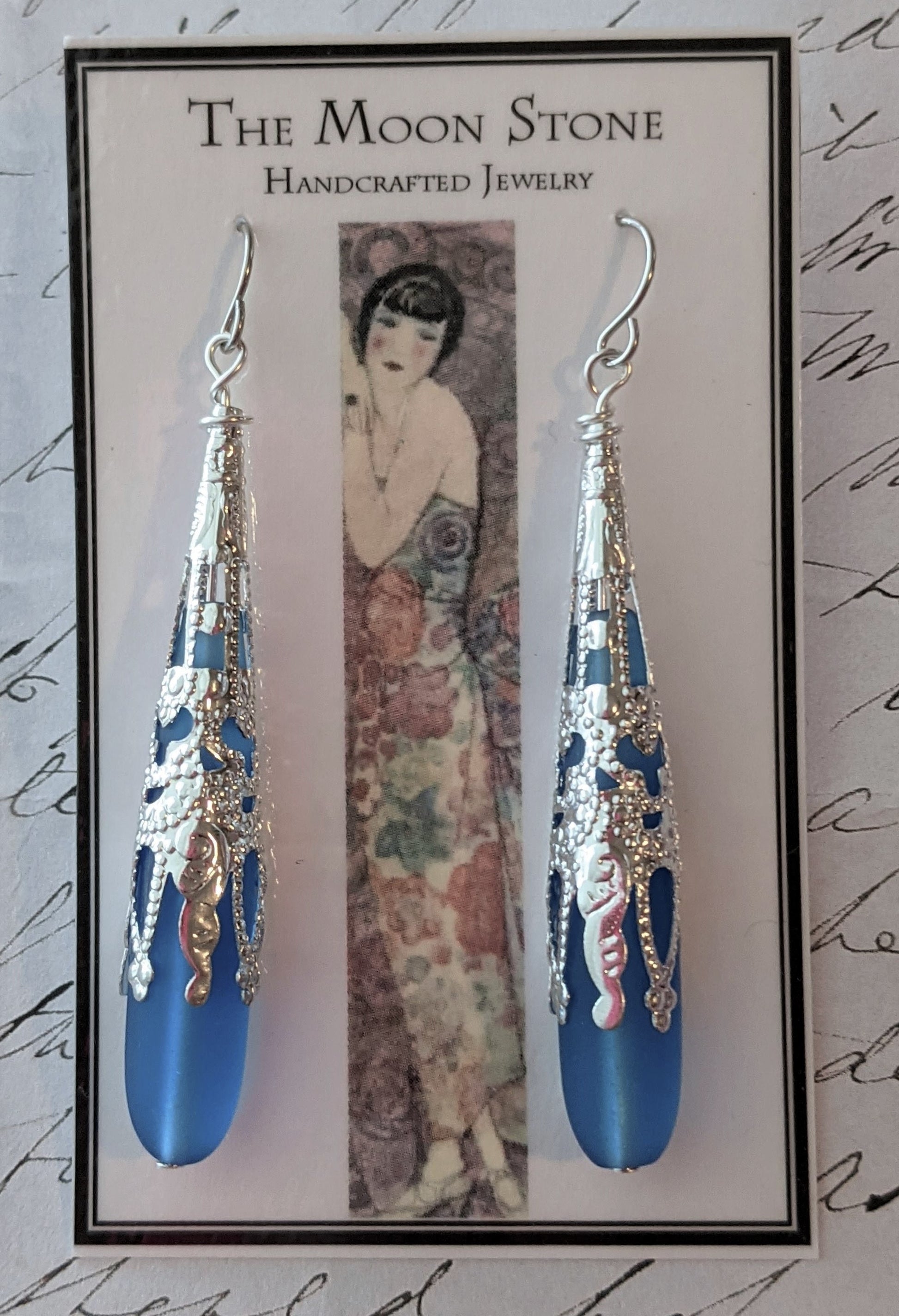 1920s Sea Glass Drop Earrings ~ Sapphire
