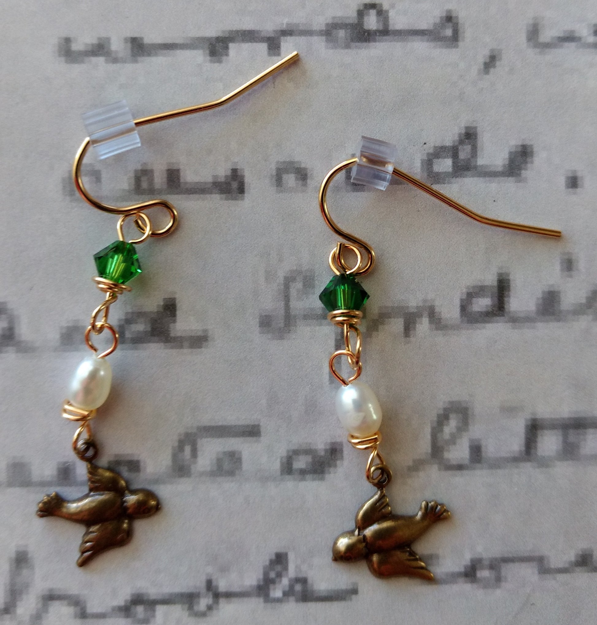 Inspired by the spirit of beloved Anne of Green Gables, these gold-plated brass earring drops are accented with green crystals, rice pearls, and soaring bird charm. Designed by The Marble Faun.