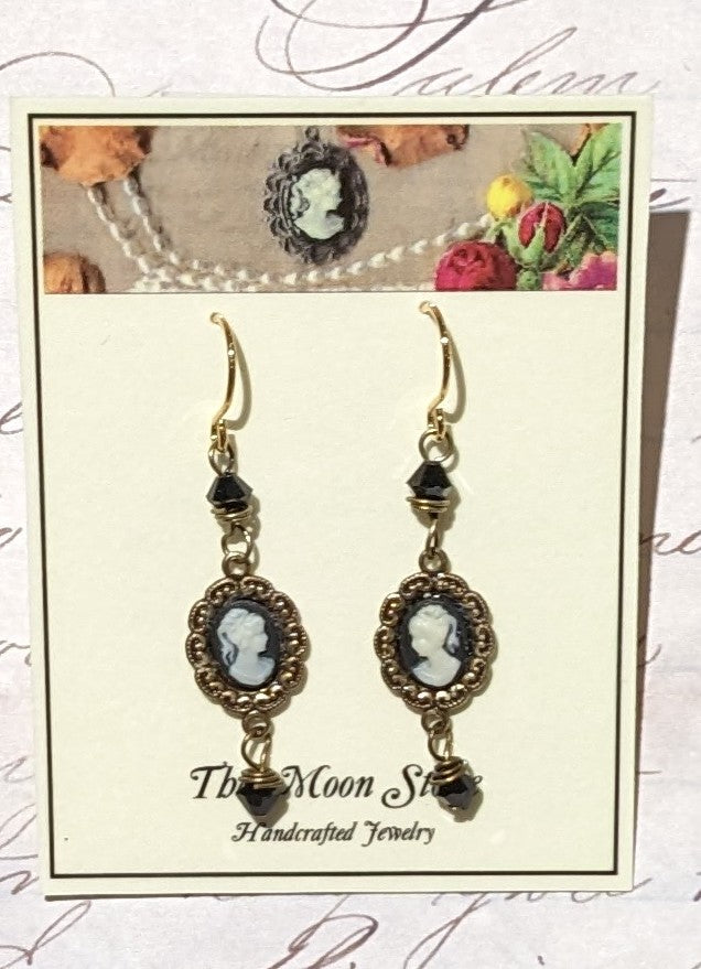 Delicate Victorian-inspired cameo drop earrings are set in brass and accented with crystals. Assorted colors.