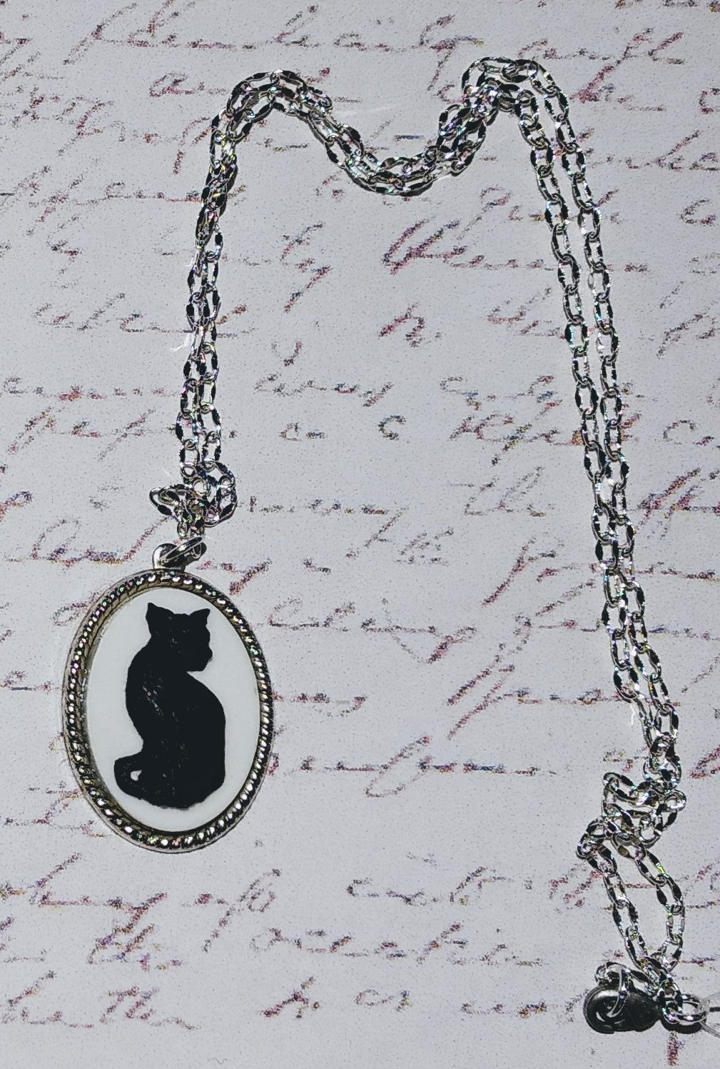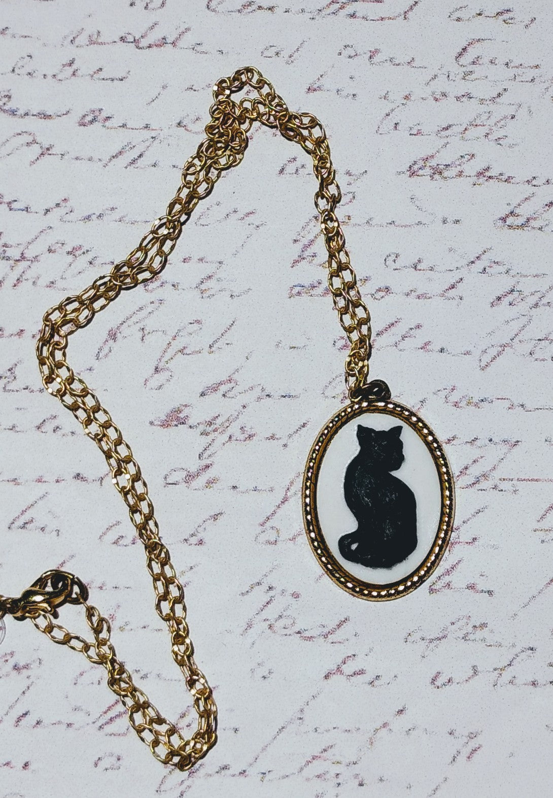 Unique Black Cat Cameo set in "antique gold/brass" or "antique silver" plating with 18" chain and lobster clasp. Designed exclusively for The Marble Faun Books & Gifts.