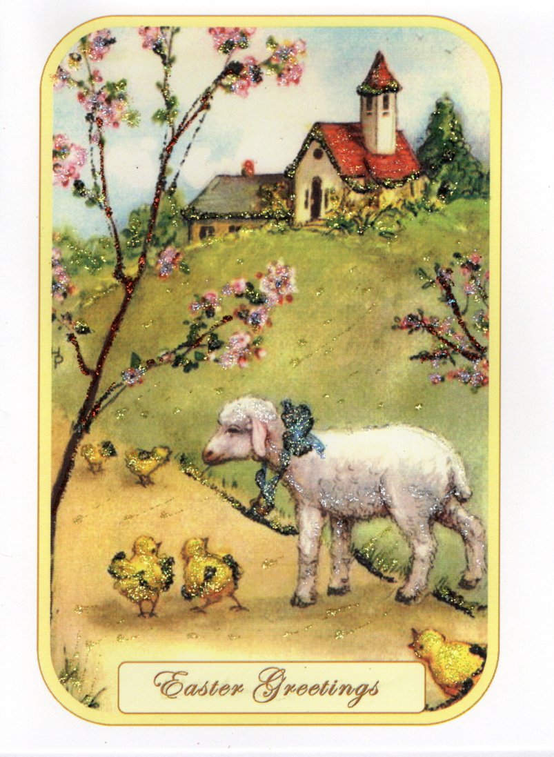 Easter Greetings ~ Lamb & Chicks Pastoral Glitter Card