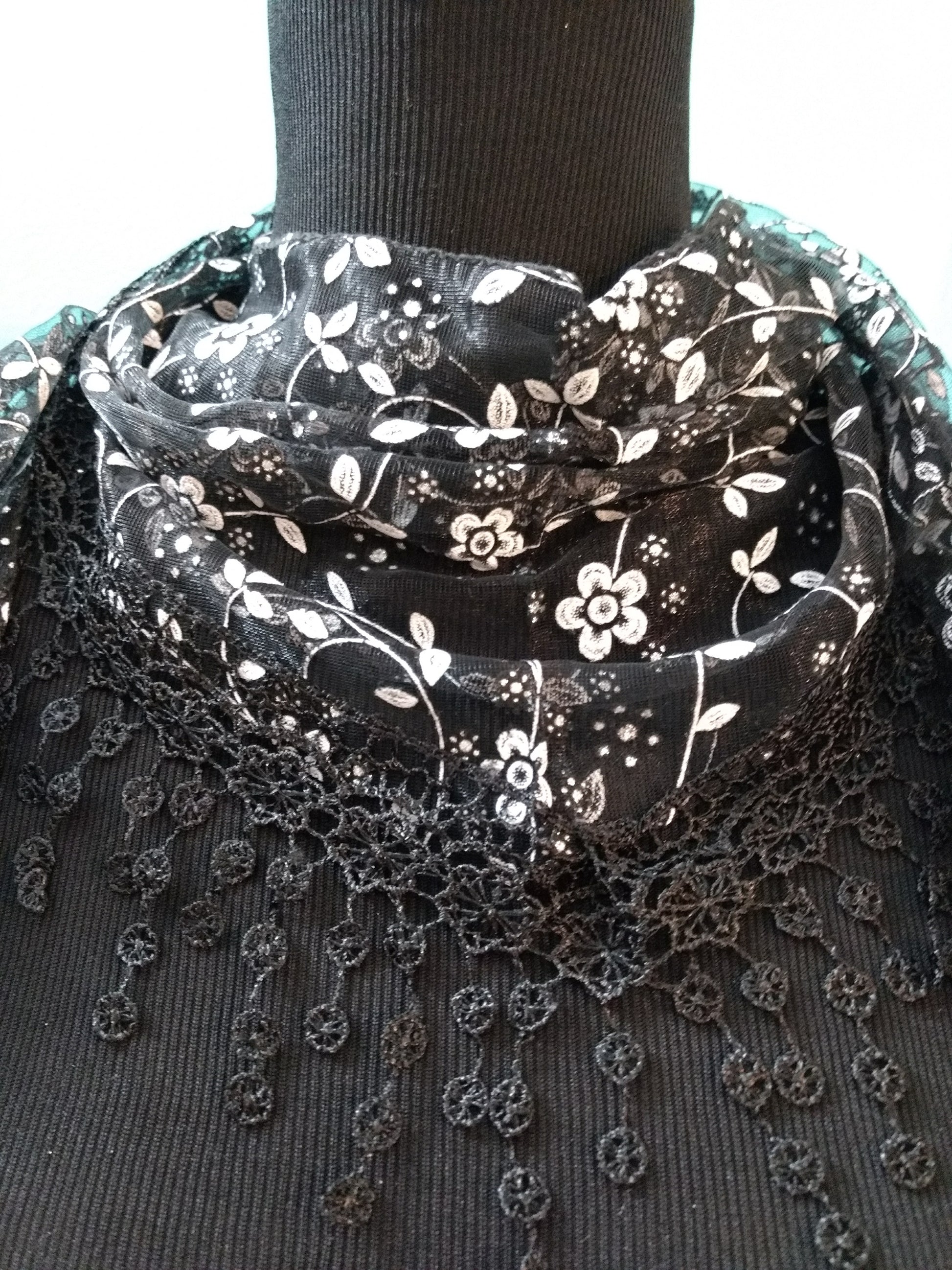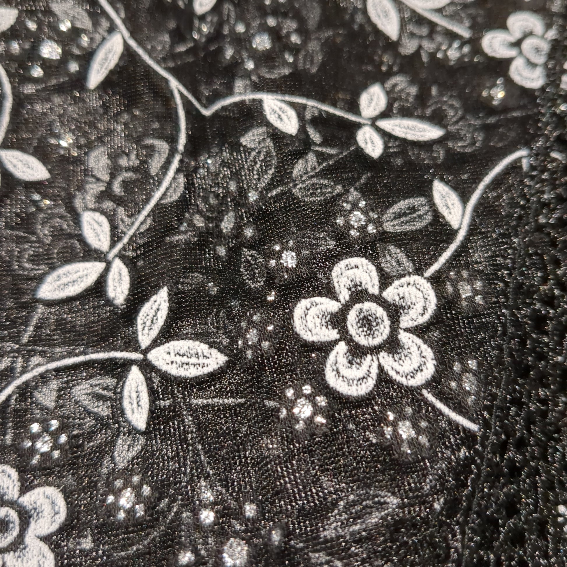 Elegant lightweight triangle tassel scarf with glittered floral design.