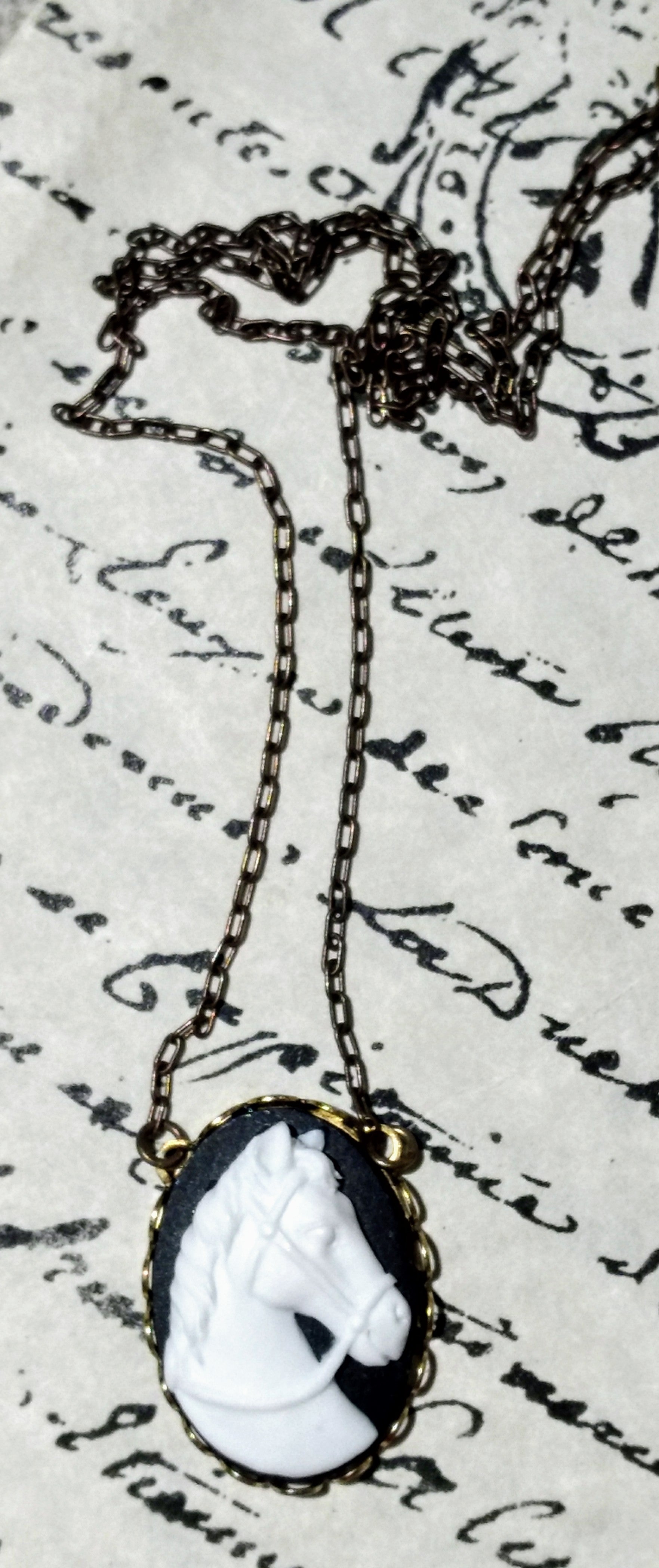 Unique Horse Cameo set in brass or antique silver-plated brass with 18" brass or silver-plated brass chain and lobster clasp. Designed exclusively for The Marble Faun Books & Gifts.