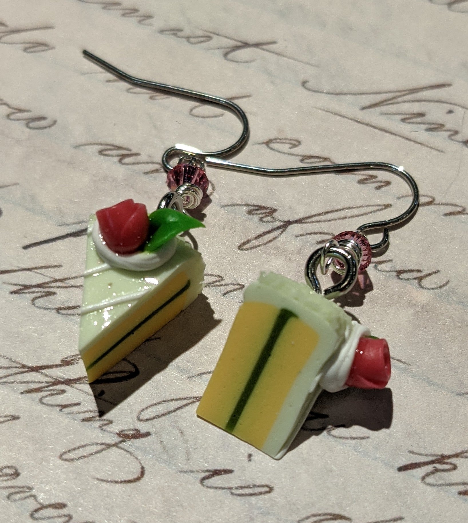 Adorable miniature frosted cake slices on stainless steel wires. Wire-wrapped with matching crystals. Made exclusively by The Marble Faun.