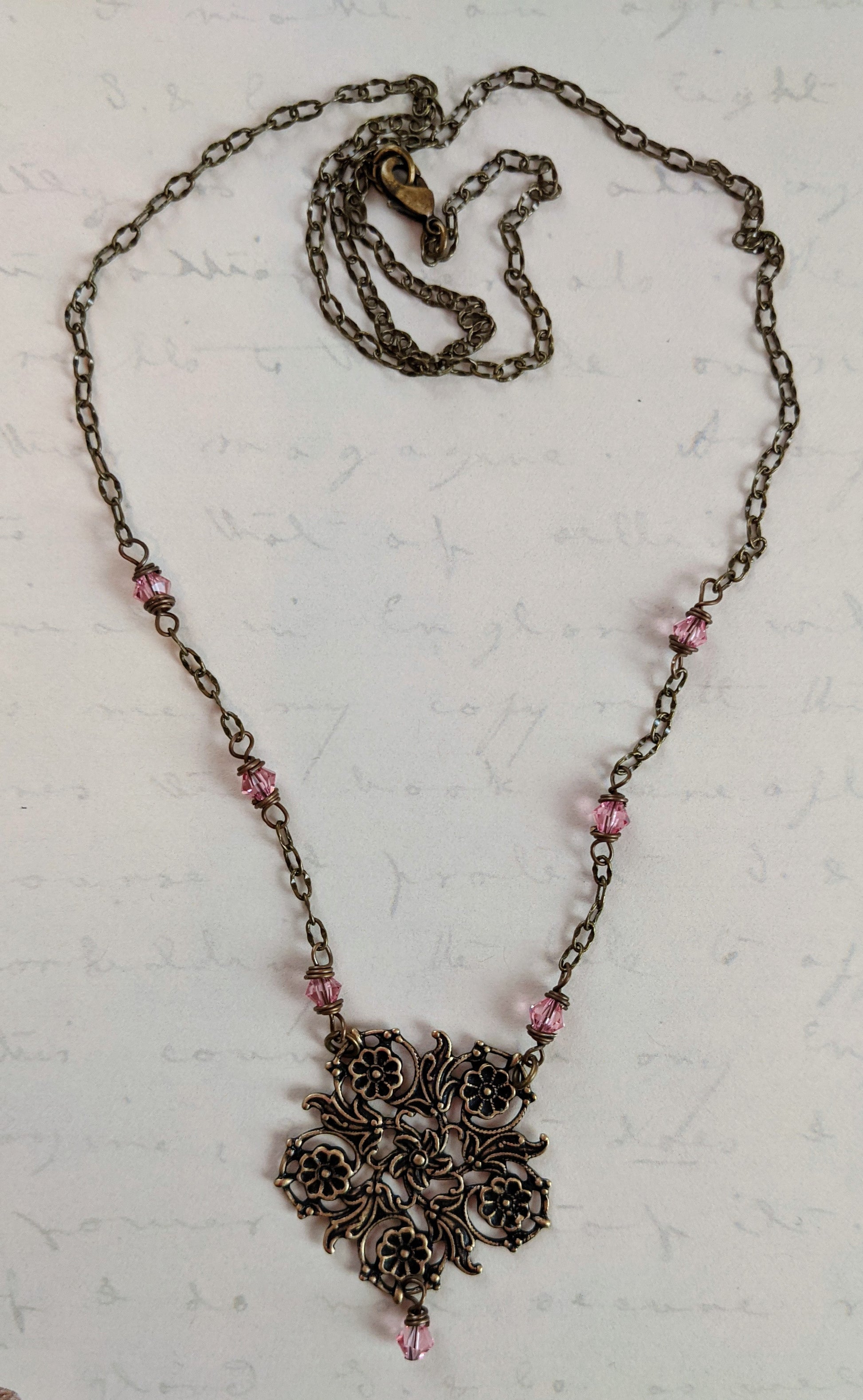 Inspired by Louisa May Alcott's pink hyacinth that bloomed in the spring of 1868, bringing her the fortune of a "true prophet." With the blossom, she received on that very same day an advance of $100 to write a column and soon after she would begin scribing her beloved classic Little Women. This brass-plated confection is accented with wire-wrapped pink crystals. Designed by The Marble Faun.