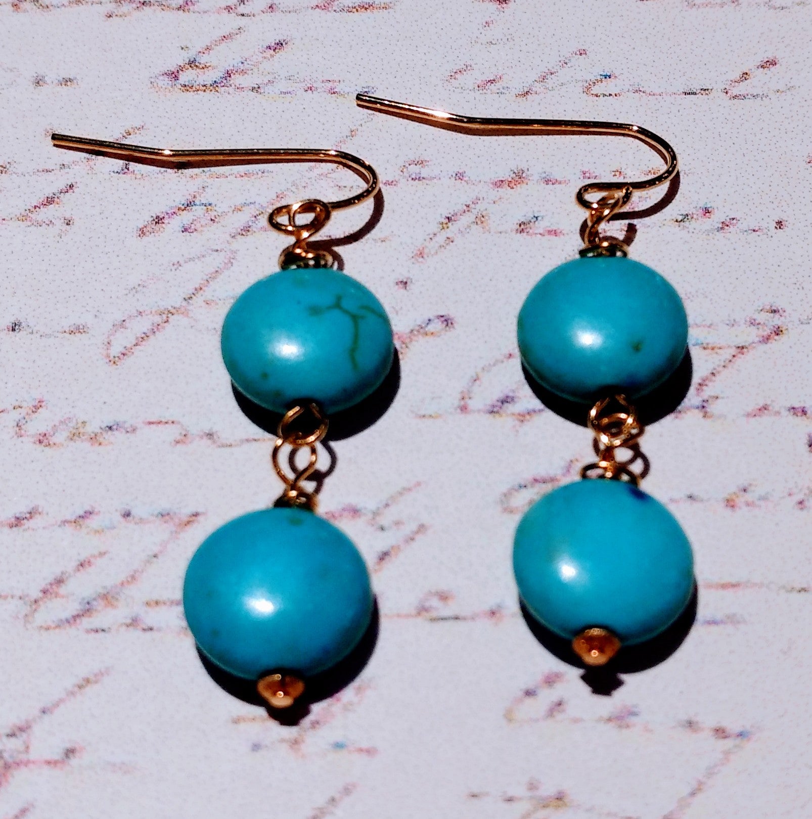 Magnesite beads double wrapped in gold-tone brass wire, these earrings are as fashionable as they are soothing to the mind. These gemstones promote creativity, self-confidence and self-esteem. Handcrafted by The MoonStone Handcrafted Jewelry in Salem, MA.