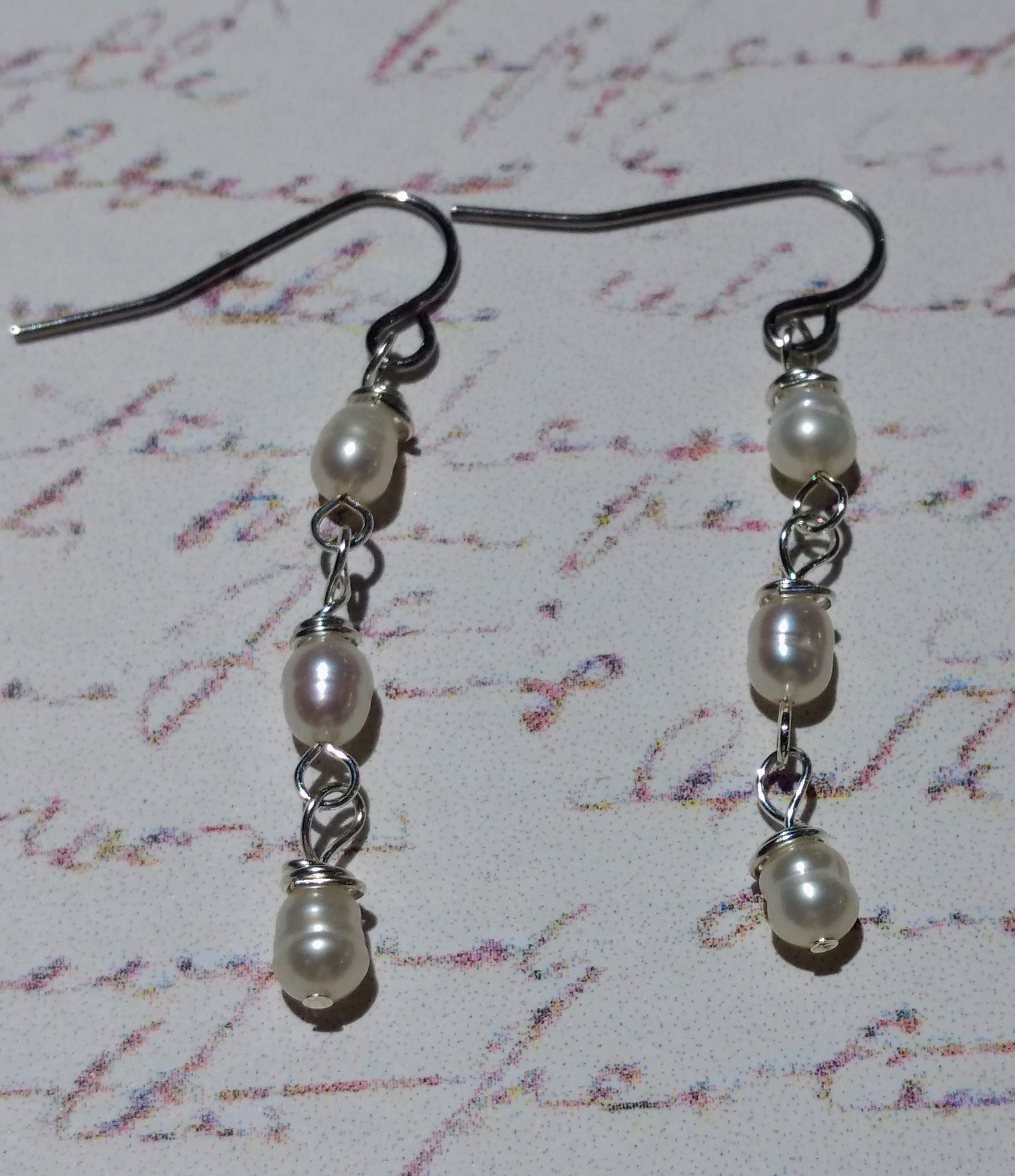 Three Freshwater rice-shaped pearls wrapped in silver-plated brass wire. Handcrafted by The MoonStone Handcrafted Jewelry in Salem, MA.