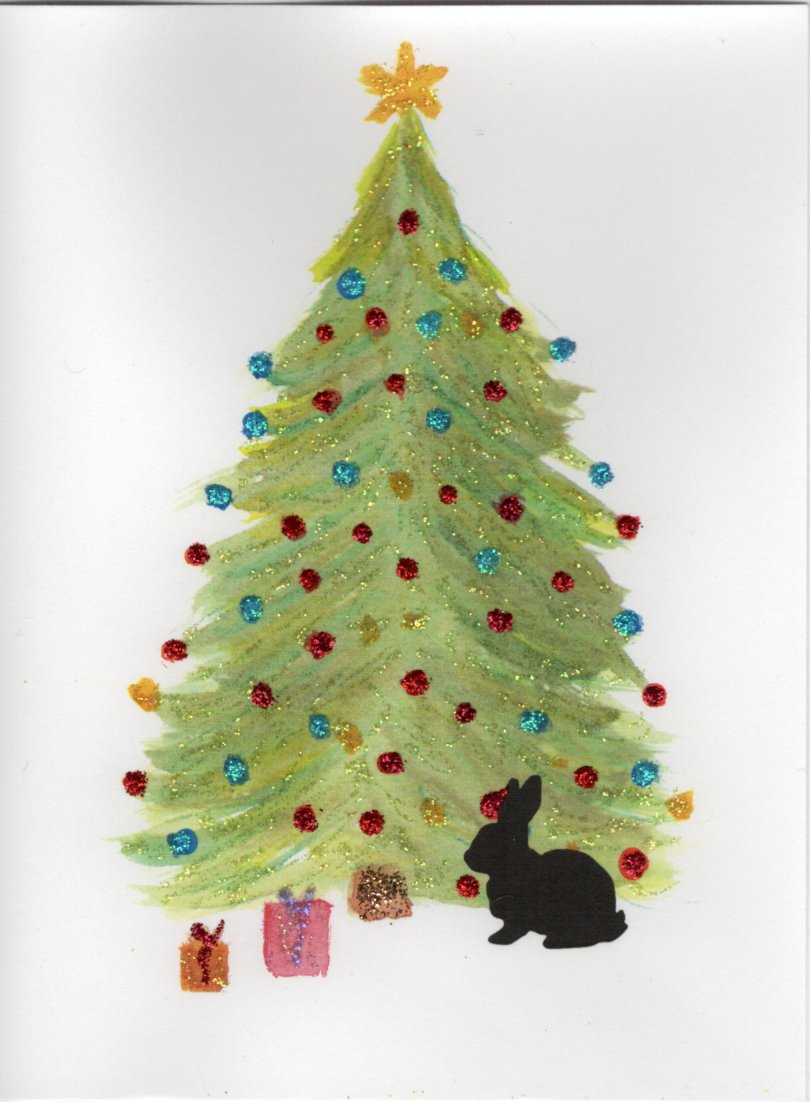 Rabbit Under Christmas Tree Watercolor Glitter Card