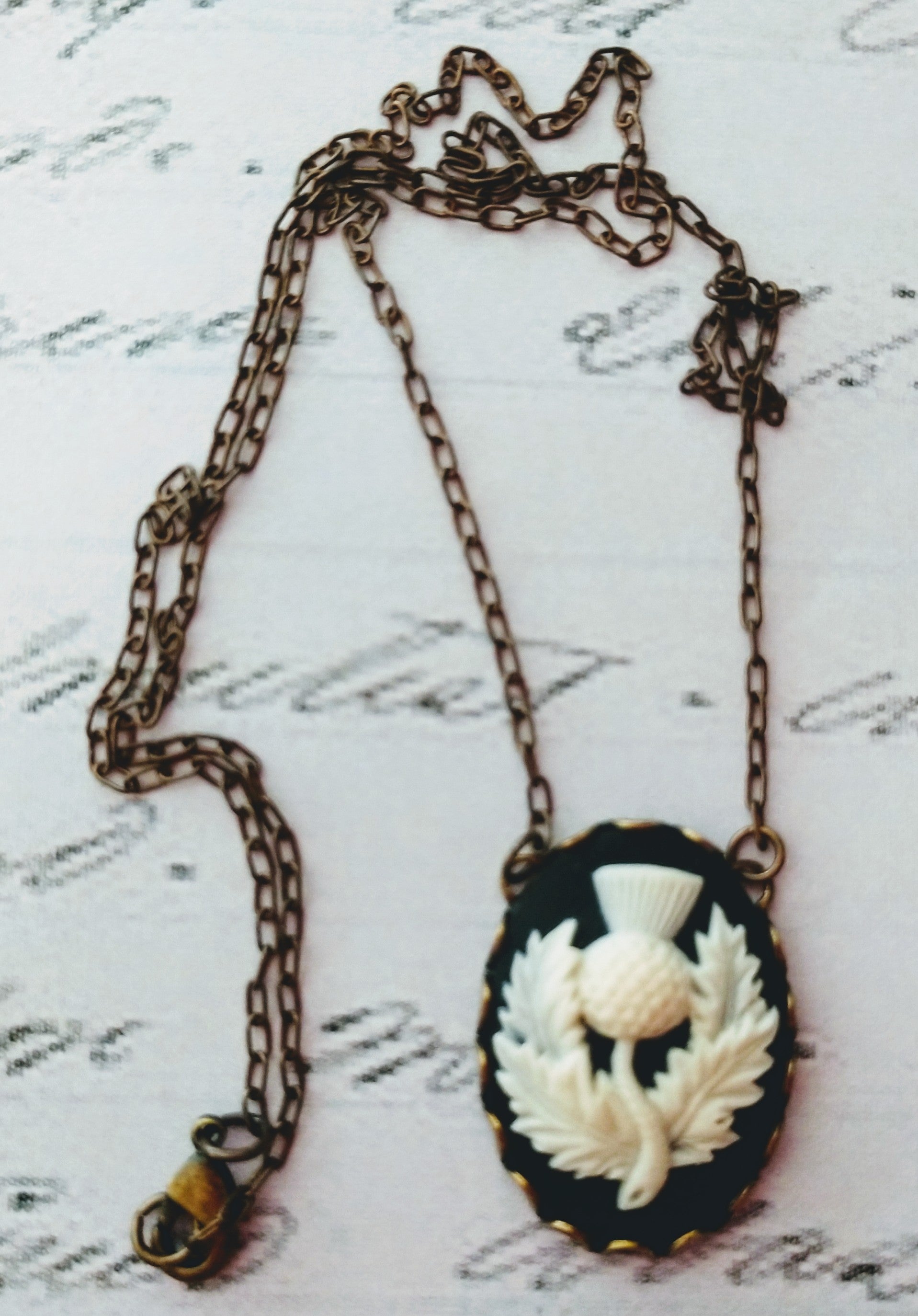 Unique Scottish Thistle Cameo set in brass or antique silver-plated brass with 18" brass or silver-plated brass chain and lobster clasp. Designed exclusively for The Marble Faun Books & Gifts.