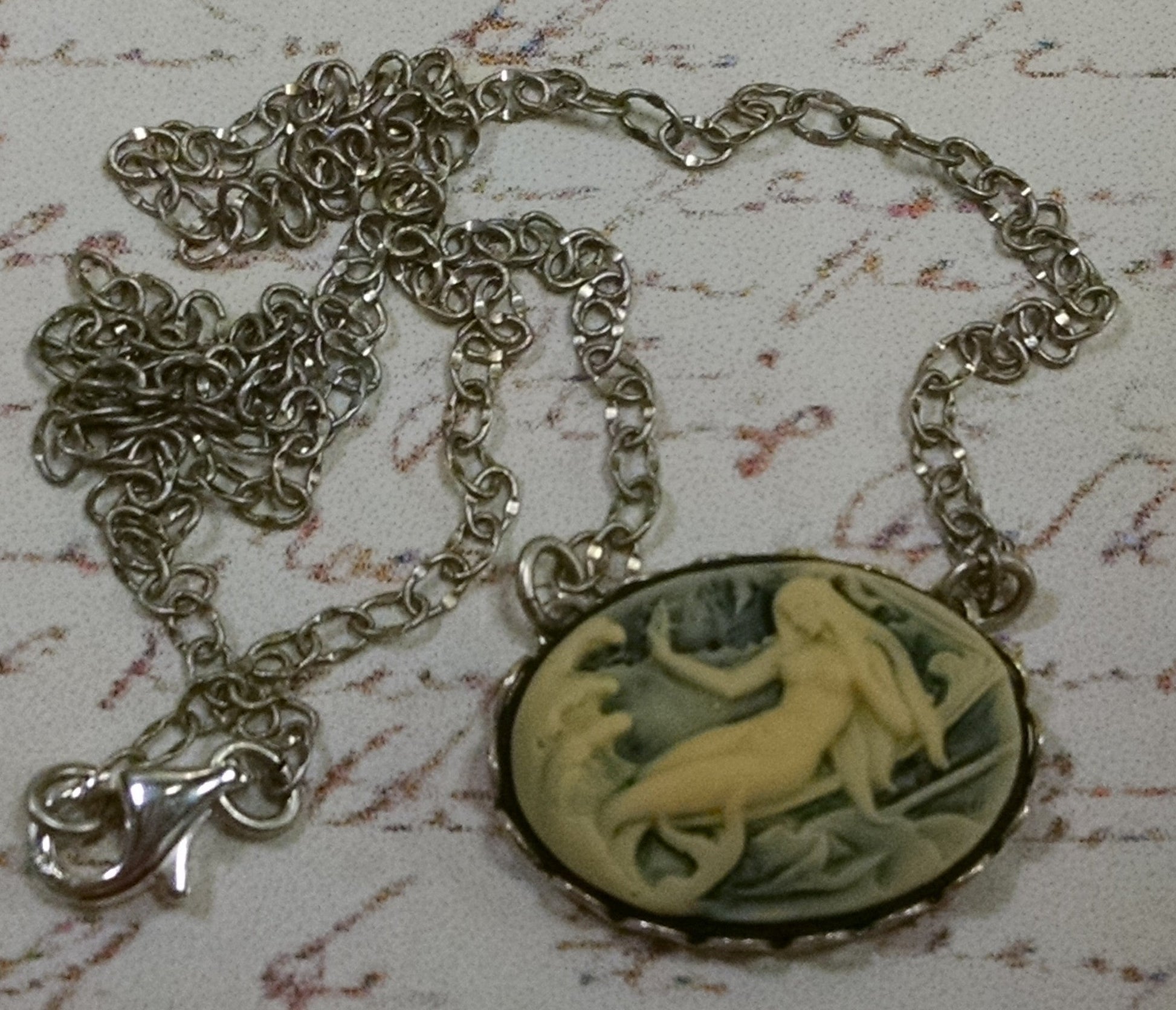 Unique Mermaid Cameo set in antique silver-plated brass with 18" silver-plated brass chain and lobster clasp. Designed exclusively for The Marble Faun Books & Gifts.
