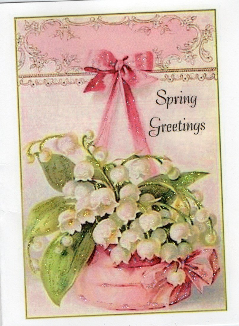 Spring Greetings ~ Lilies of the Valley in Pink Basket Glitter Card