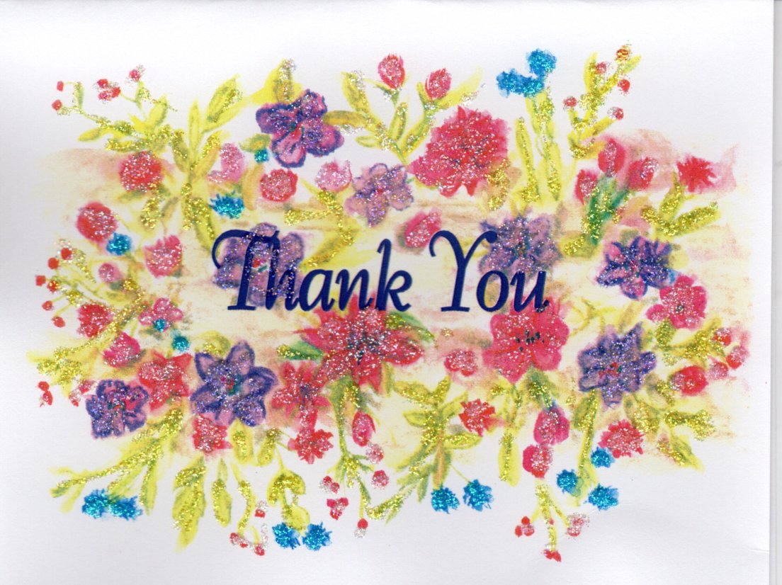 THANK YOU ~ Burst of Flowers Watercolor Print Glitter Card