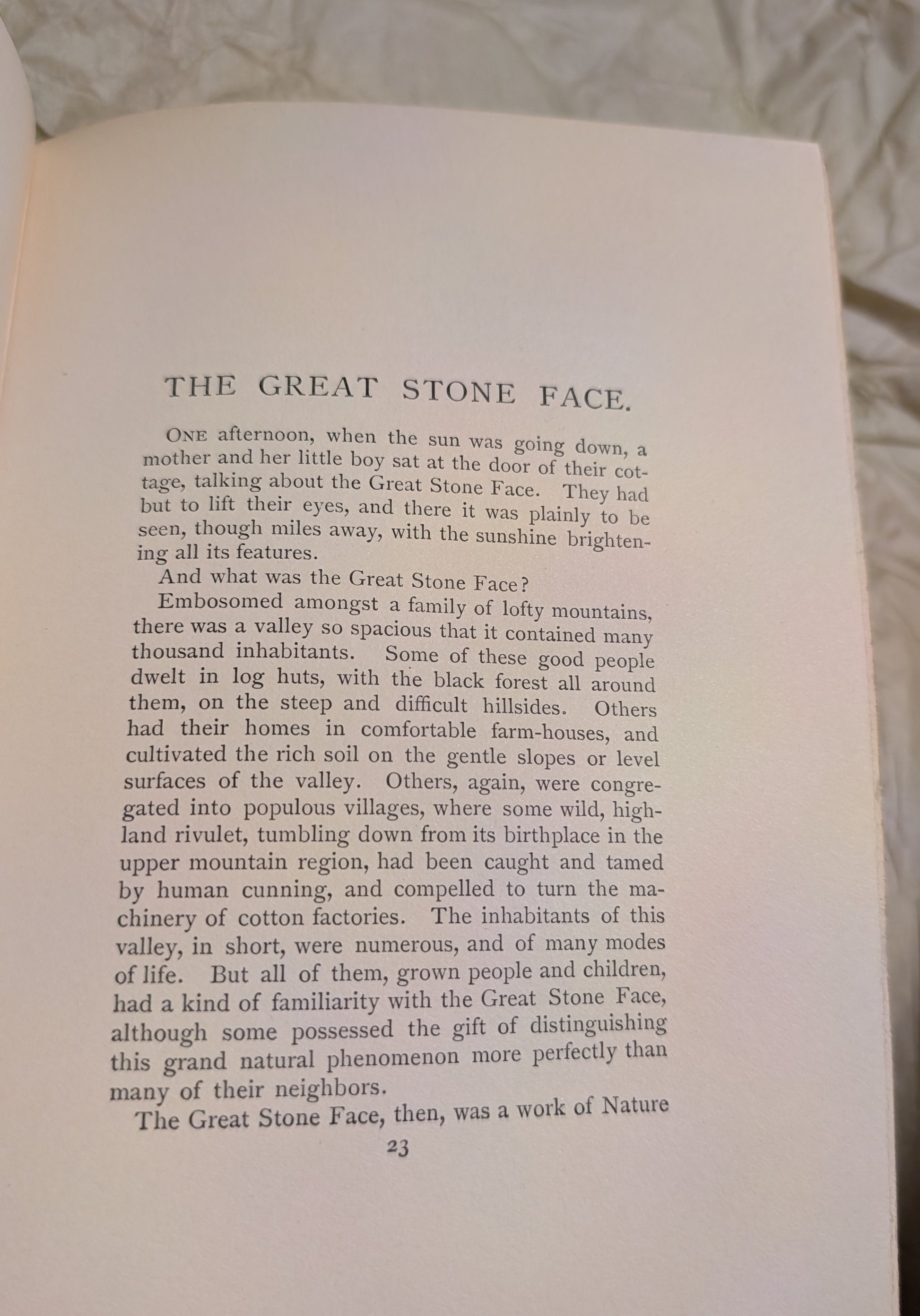 Desmond Publishing Co, Boston, for Thomas Crowell Publishing, 1899. Tight copy, gold leaf on top, hand-cut pages. Frontispiece illustration. Green cloth, home library spine. Includes stories: Ethan Brand, The Snow Image, The Great Stone Face.