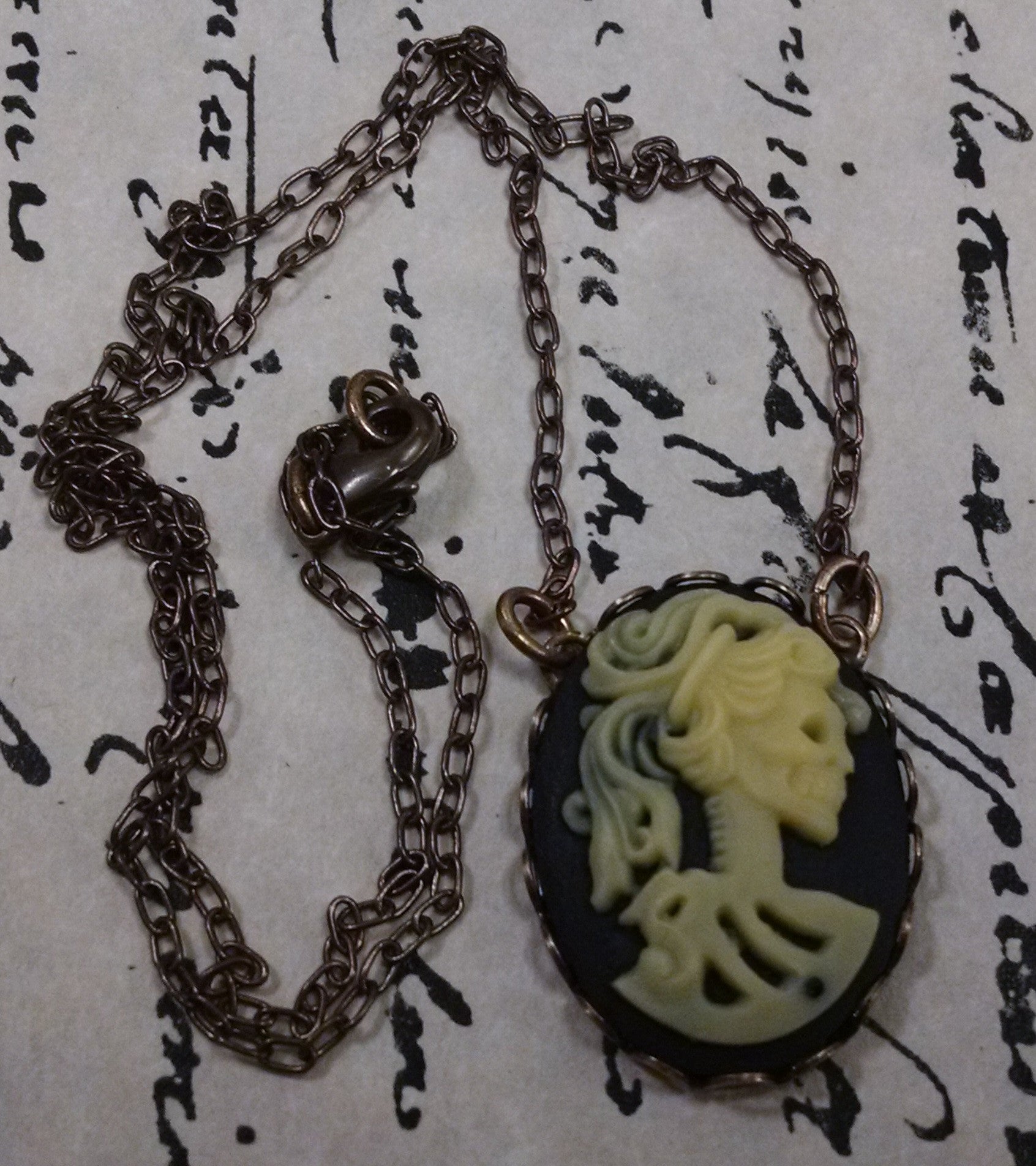 Unique Victorian Lady Skull Cameo set in brass or silver-plated brass with 18" brass chain and lobster clasp. Designed exclusively for The Marble Faun Books & Gifts.